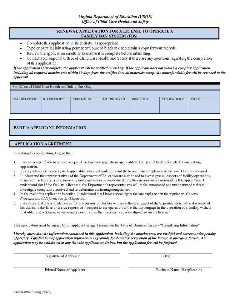 Virginia Department of Education (DOE) Office of Child Care Health and Safety RENEWAL APPLICATION FOR A LICENSE TO OPERATE A FAMILY DAY SYSTEM (FDS) Complete this application in its entirety, as appropriate.