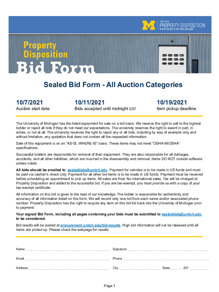 Sealed Bid Form All Auction Categories 10/7/202110/11/202110/19/2021Auction start dates accepted until midnight Estate pickup deadline University of Michigan has the listed equipment for sale on a