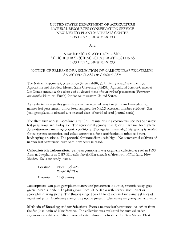 UNITED STATES DEPARTMENT OF AGRICULTURE NATURAL RESOURCES CONSERVATION SERVICE NEW MEXICO PLANT MATERIALS CENTER LOS LUNAR, NEW MEXICO And NEW MEXICO STATE UNIVERSITY AGRICULTURAL SCIENCE CENTER AT