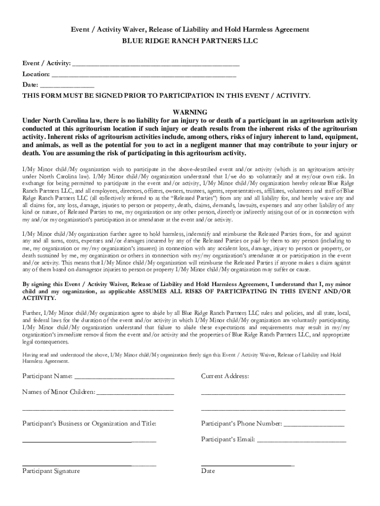 Event / Activity Waiver, Release of Liability and Hold Harmless Agreement BLUE RIDGE RANCH PARTNERS LLC Event / Activity: ___ Location: ___ Date: ___ THIS FORM MUST BE SIGNED PRIOR TO PARTICIPATION