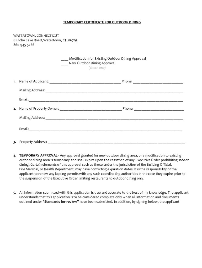 TEMPORARY CERTIFICATE FOR OUTDOOR DININGWATERTOWN, CONNECTICUT 61 Echo Lake Road, Watertown, CT 06795 8609455266___ Modification for Existing Outdoor Dining Approval ___ New Outdoor Dining Approval