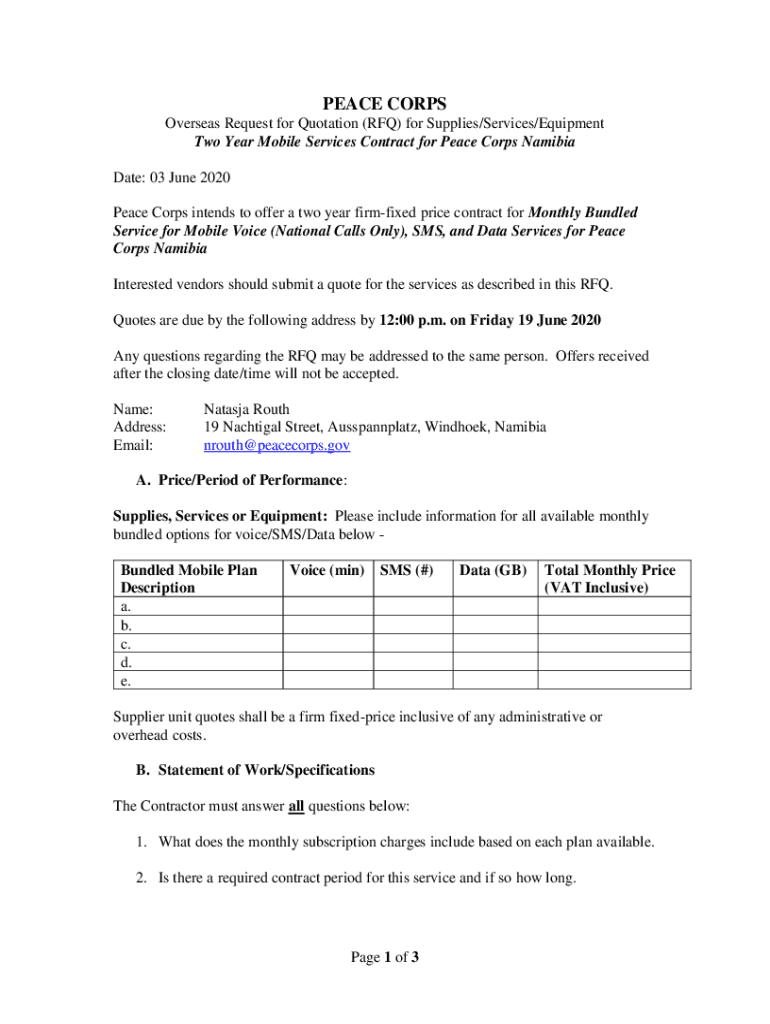 PEACE CORPS Overseas Request for Quotation (RFQ) for Supplies/Services/Equipment Two Year Mobile Services Contract for Peace Corps Namibia Date: 03 June 2020 Peace Corps intends to offer a two-year