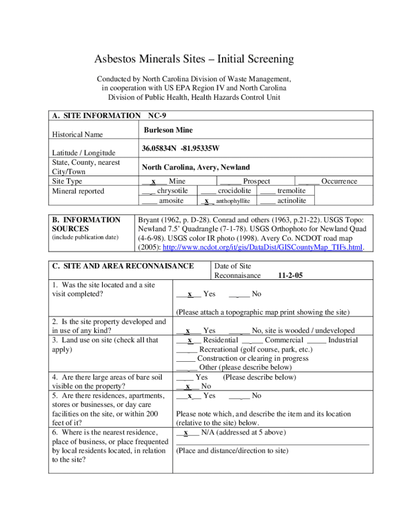 Asbestos Minerals Sites Initial Screening Conducted by North Carolina Division of Waste Management, in cooperation with US EPA Region IV and North Carolina Division of Public Health, Health Hazards