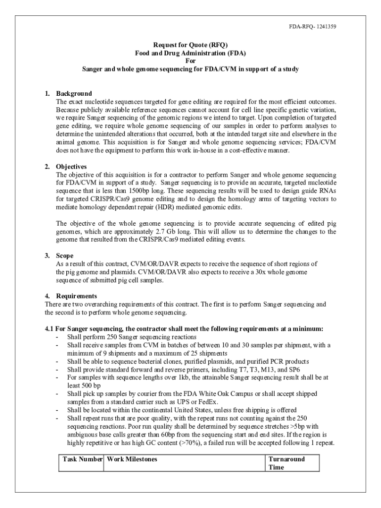 FDARFQ1241359Request for Quote (RFQ) Food and Drug Administration (FDA) For Sanger and whole genome sequencing for FDA/CVM in support of a study 1. Background The exact nucleotide sequences targeted