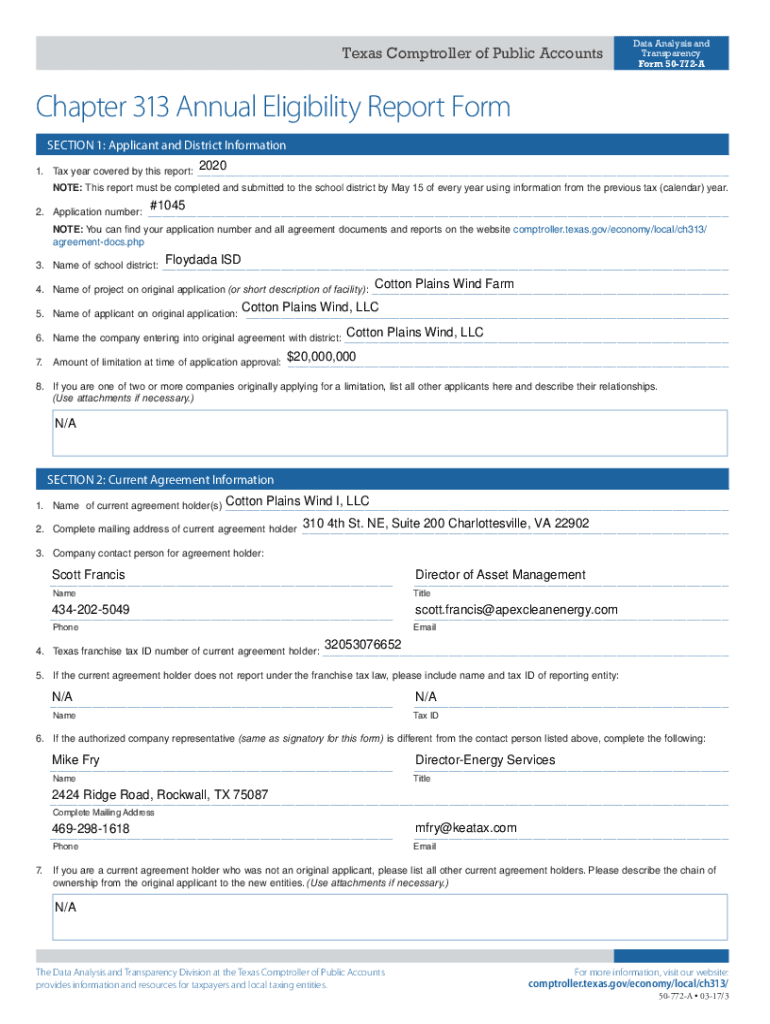 Texas Comptroller of Public AccountsData Analysis and Transparency Form 50772AChapter 313 Annual Eligibility Report Form SECTION 1: Applicant and District Information 1. Tax year covered by this report:2020