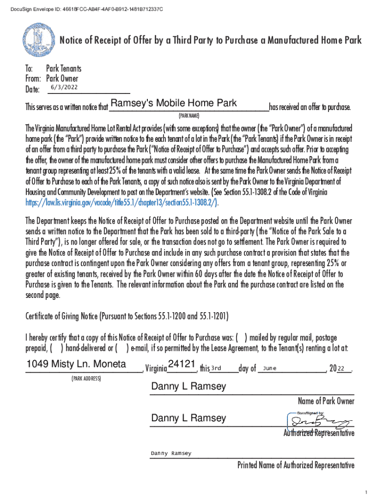 DocuSign Envelope ID: 46618FCCAB4F4AF0B9121481B712337CNotice of Receipt of Offer by a Third Party to Purchase a Manufactured Home Park Tenants To: From: Park Owner 6/3/2022 Date: ___Ramsey\'s Mobile