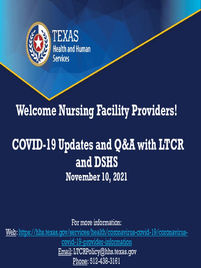 Welcome to Nursing Facility Providers! COVID-19 Updates and Q&A with LCR and DSS November 10, 2021For more information: Web: https://hhs.texas.gov/services/health/coronaviruscovid19/coronaviruscovid19providerinformation
