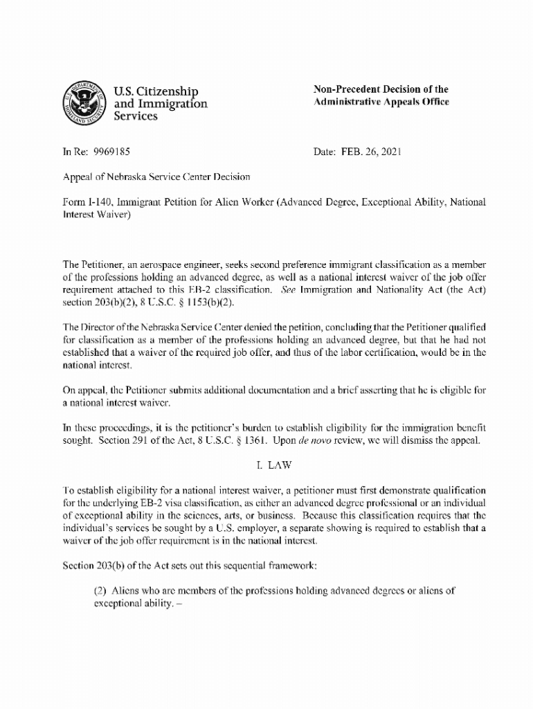 Precedent Decision of the Administrative Appeals Office. S. Citizenship and Immigration Services In Re: 9969185Date: FEB. 26, 2021Appeal of Nebraska Service Center Decision Form 1140, Immigrant Petition