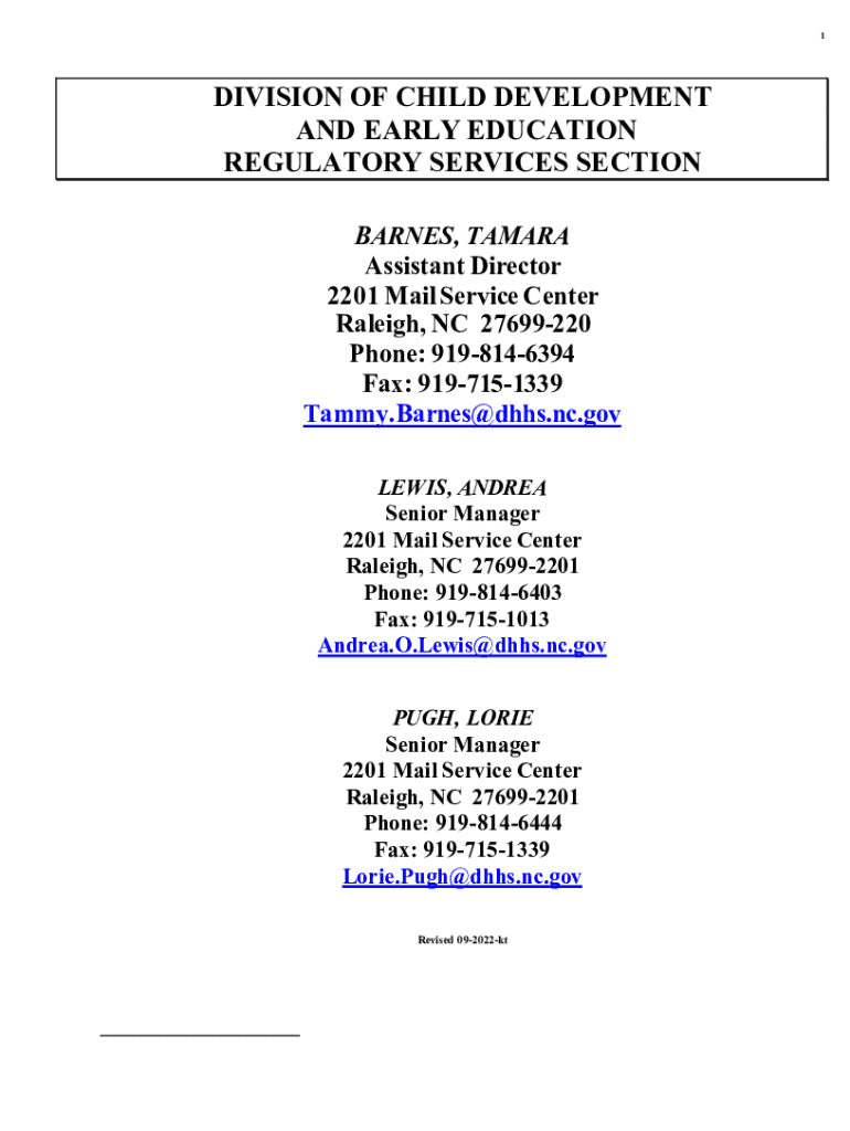 1DIVISION OF CHILD DEVELOPMENT AND EARLY EDUCATION REGULATORY SERVICES SECTION BARNES, TAMARA Assistant Director 2201 Mail Service Center Raleigh, NC 27699220 Phone: 9198146394 Fax: 9197151339 Tammy.Barnes@dhhs.nc.gov