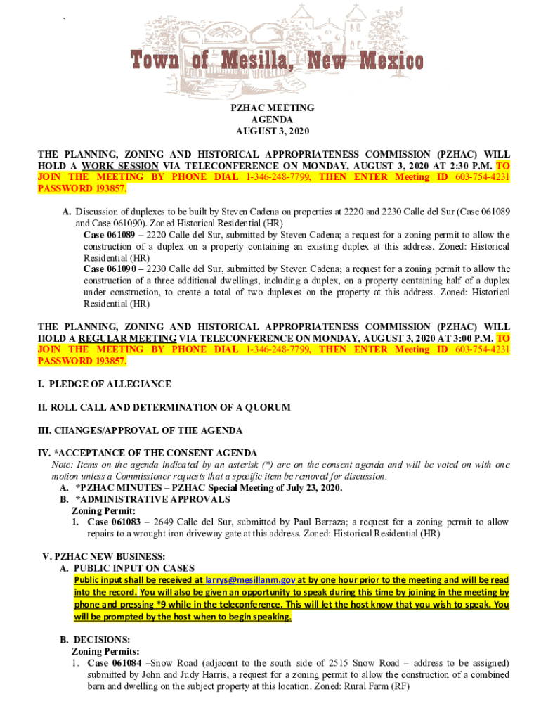 `PAC MEETING AGENDA AUGUST 3, 2020, THE PLANNING, ZONING AND HISTORICAL APPROPRIATENESS COMMISSION (PAC) WILL HOLD A WORK SESSION VIA TELECONFERENCE ON MONDAY, AUGUST 3, 2020, AT 2:30 P.M. TO JOIN