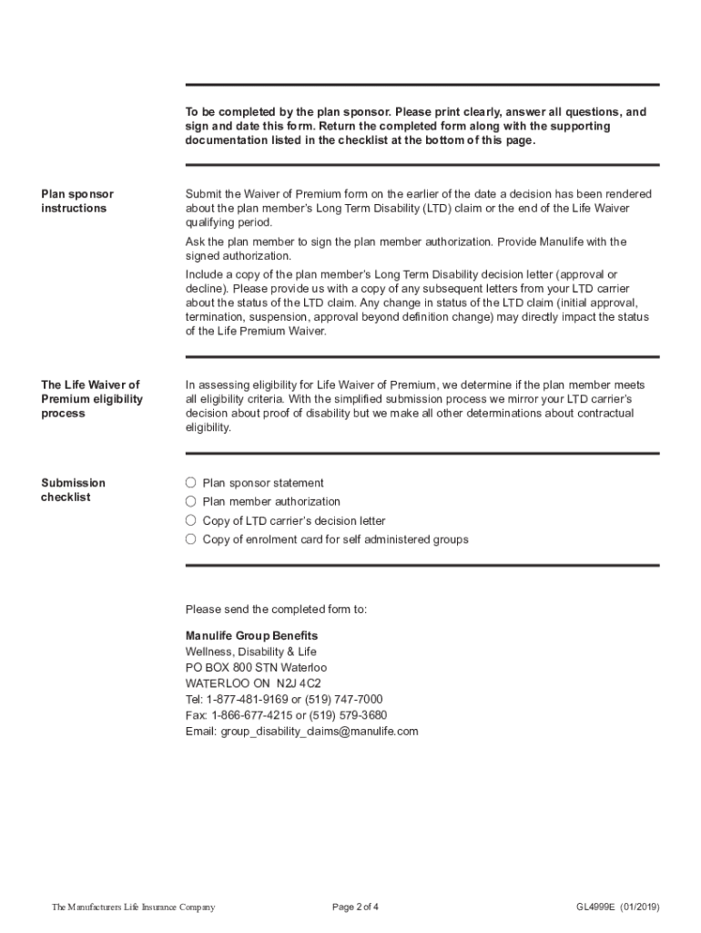Plan Sponsor Statement Condensed Life Waiver of Premium incomplete form may result in delays in the adjudication of your life waiver of premium claim. Please see page 2 for instructions. The Manufacturers