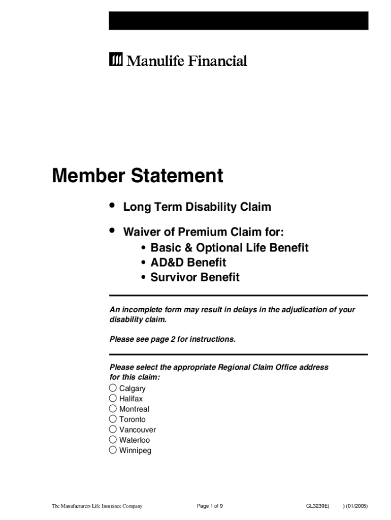 Member Statement Long Term Disability ClaimWaiver of Premium Claim for: Basic & Optional Life Benefit ADD Benefit Survivor Benefit incomplete form may result in delays in the adjudication of your