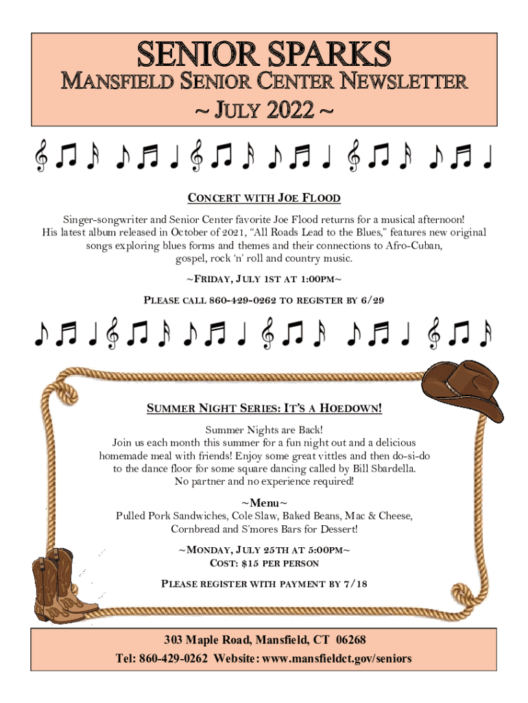 SENIOR SPARKSMANSFIELD SENIOR CENTER NEWSLETTER JULY 2022 CONCERT WITH JOE FLOOD Singer songwriter and Senior Center favorite Joe Flood returns for a musical afternoon! His latest album released in
