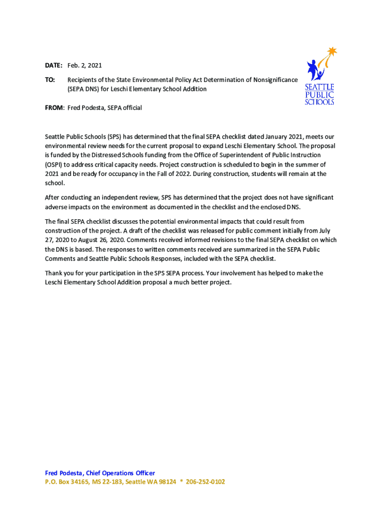 DATE: Feb. 2, 2021 TO:Recipients of the State Environmental Policy Act Determination of Nonsignificance (SEPA DNS) for Les chi Elementary School AdditionFROM: Fred Modest, SEPA official Seattle Public