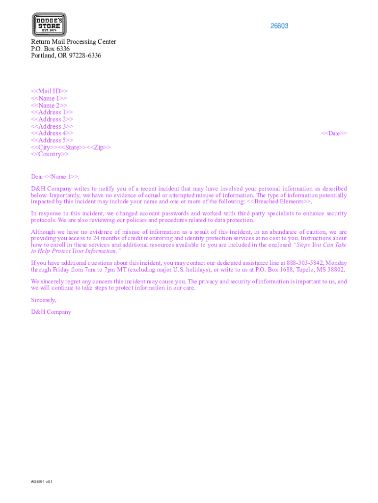 26603Return Mail Processing Center P.O. Box 6336 Portland, OR 972286336Mail ID Name 1 Name 2 Address 1 Address 2 Address 3 Address 4Address 5 CityStateZip CountryDateDear Name 1: D&H Company writes