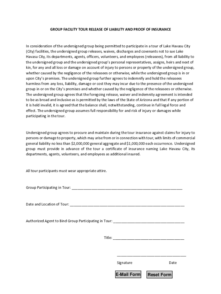 GROUP FACILITY TOUR RELEASE OF LIABILITY AND PROOF OF INSURANCE In consideration of the undersigned group being permitted to participate in a tour of Lake Havasu City (City) facilities, the undersigned