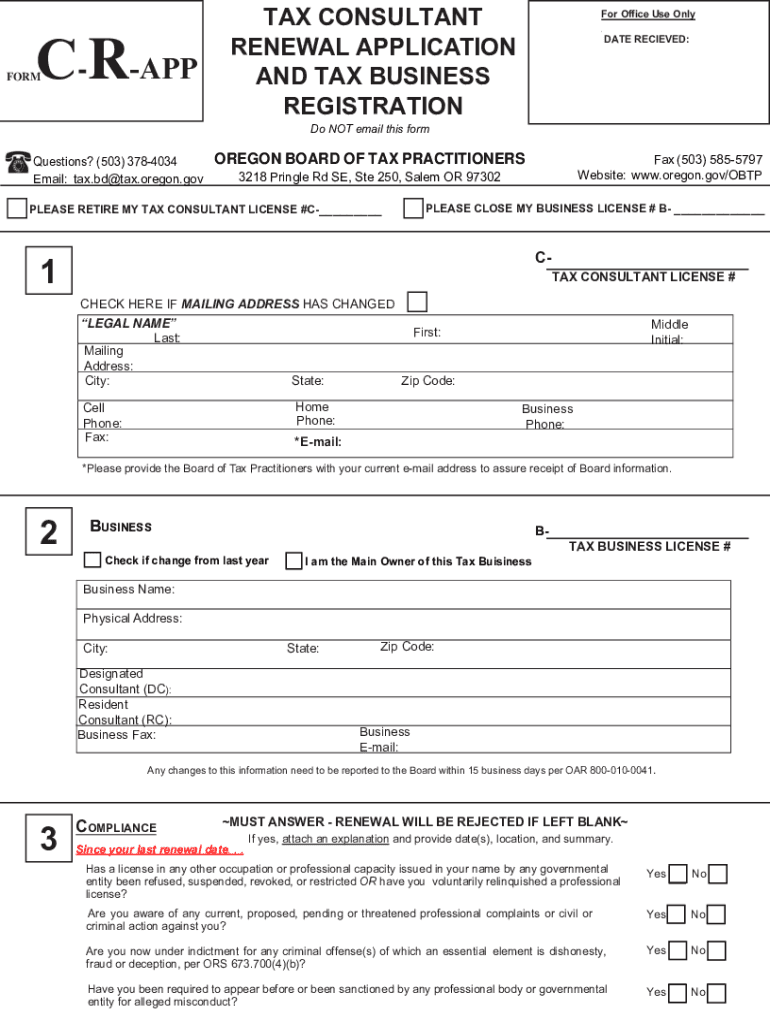 CRAPPFORMTAX CONSULTANT RENEWAL APPLICATION AND TAX BUSINESS Registration Office Use Only DATE RELIEVED:Do NOT email these formulations? (503) 3784034 Email: tax.bd@tax.oregon.govFax (503) 5855797