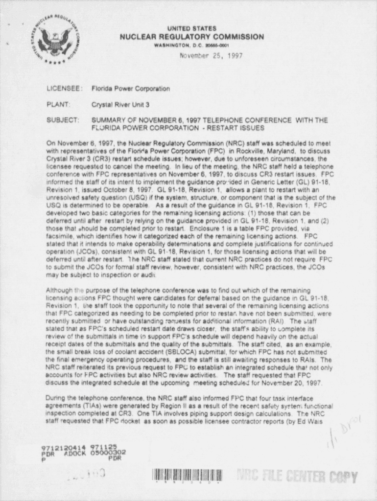 _._ _ _ _ _ _ _ ___. _ _ __.(, |1,_.i JJ j[%%!UNITED STATES**nuclear REGULATORY COMMISSION.i\']Washington, D.C. See86 EEM p×...×November 25, 1997i.]licensee: Florida Power CorporationPLANTi_ Crystal