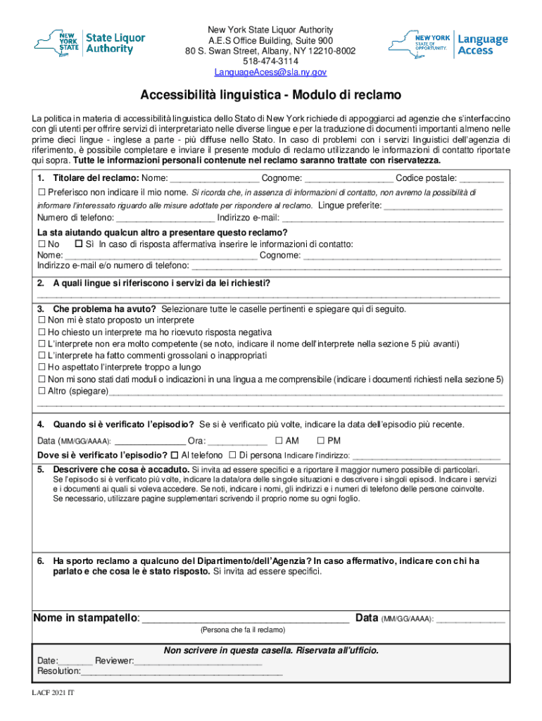 New York State Liquor Authority A.E.S Office Building, Suite 900 80 S. Swan Street, Albany, NY 122108002 5184743114 LanguageAcess@sla.ny.govAccessibilit linguistic Modulo DI reclaim La political in