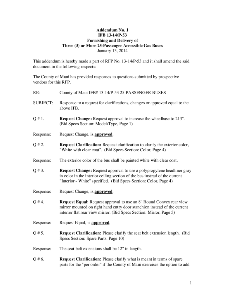 Addendum No. 1 IF 1314/P53 Furnishing and Delivery of Three (3) or More 25Passenger Accessible Gas Buses January 13, 2014, This addendum is hereby made a part of RFP No. 1314/P53, and it shall amend