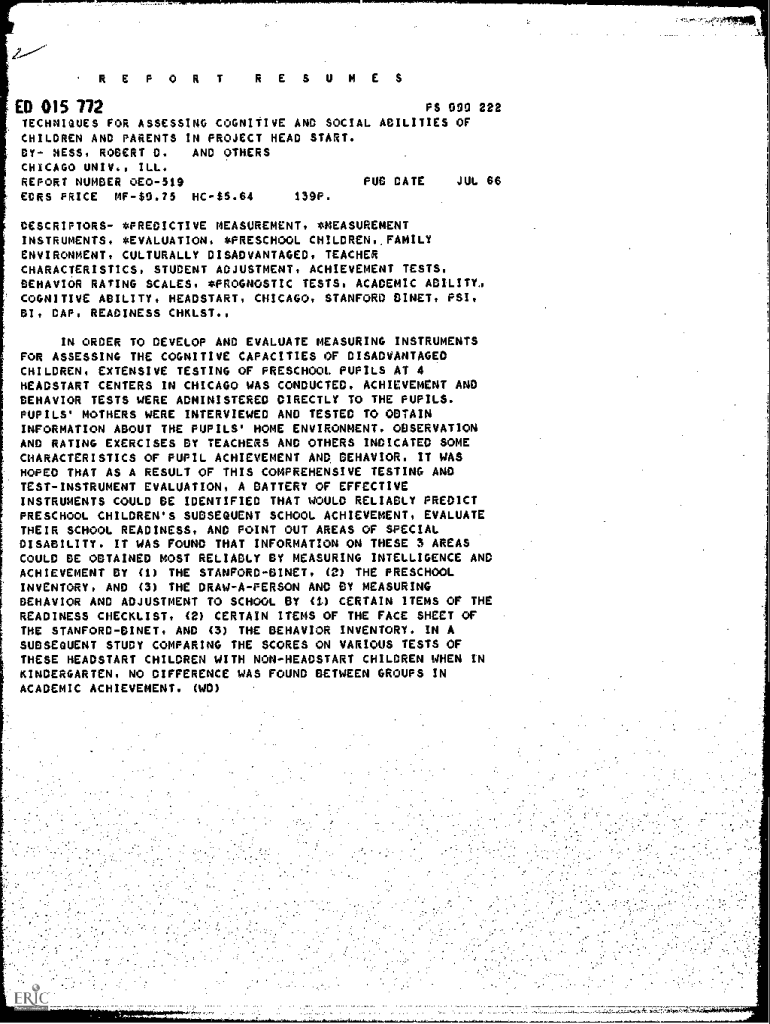 REFER RESUMES 090 222 TECHNIQUES FOR ASSESSING COGNITIVE AND SOCIAL ABILITIES OF CHILDREN AND PARENTS IN PROJECT HEAD START. AND OTHERS BY HESS, ROBERT 0. CHICAGO UNIV., ILL. JUL 66 PUB DATE REPORT