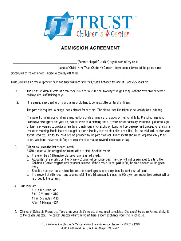 ADMISSION AGREEMENT I, ___ (Parent or Legal Guardian) agree to enroll my child, ___ (Name of Child) in the Trust Children's Center. I have been informed of the policies and procedures of the center
