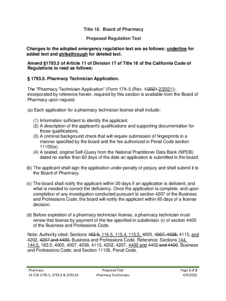 Title 16. Board of Pharmacy Proposed Regulation Text Changes to the adopted emergency regulation text are as follows: underline for added text and strike through for deleted text. Amend 1793.5 of