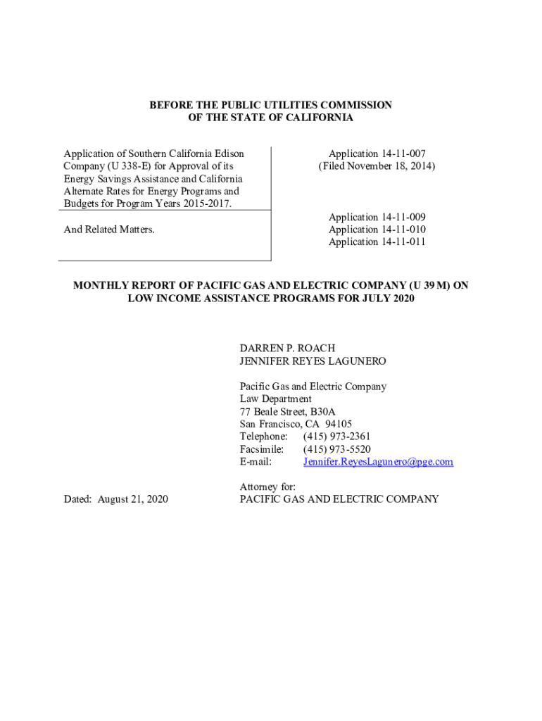 BEFORE THE PUBLIC UTILITIES COMMISSION OF THE STATE OF CALIFORNIA Application of Southern California Edison Company (U 338E) for Approval of its Energy Savings Assistance and California Alternate