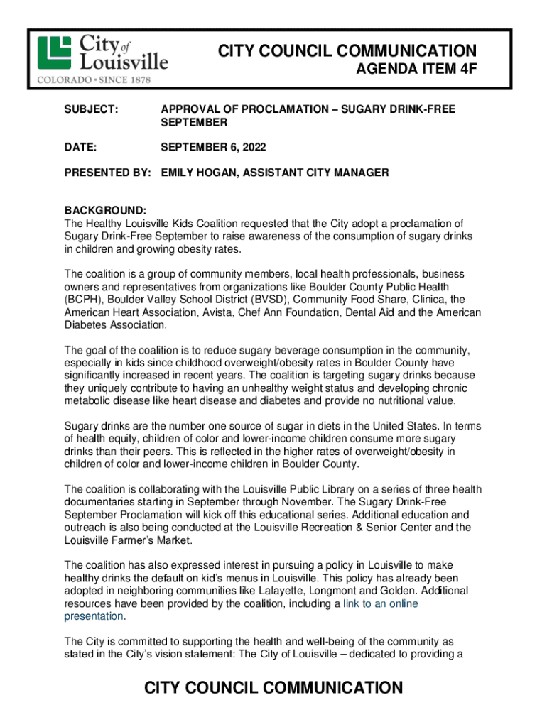 CITY COUNCIL COMMUNICATION AGENDA ITEM 4F SUBJECT:APPROVAL OF PROCLAMATION SUGARY DRINKER SEPTEMBERDATE:SEPTEMBER 6, 2022PRESENTED BY: EMILY HOGAN, ASSISTANT CITY MANAGERBACKGROUND: The Healthy Louisville