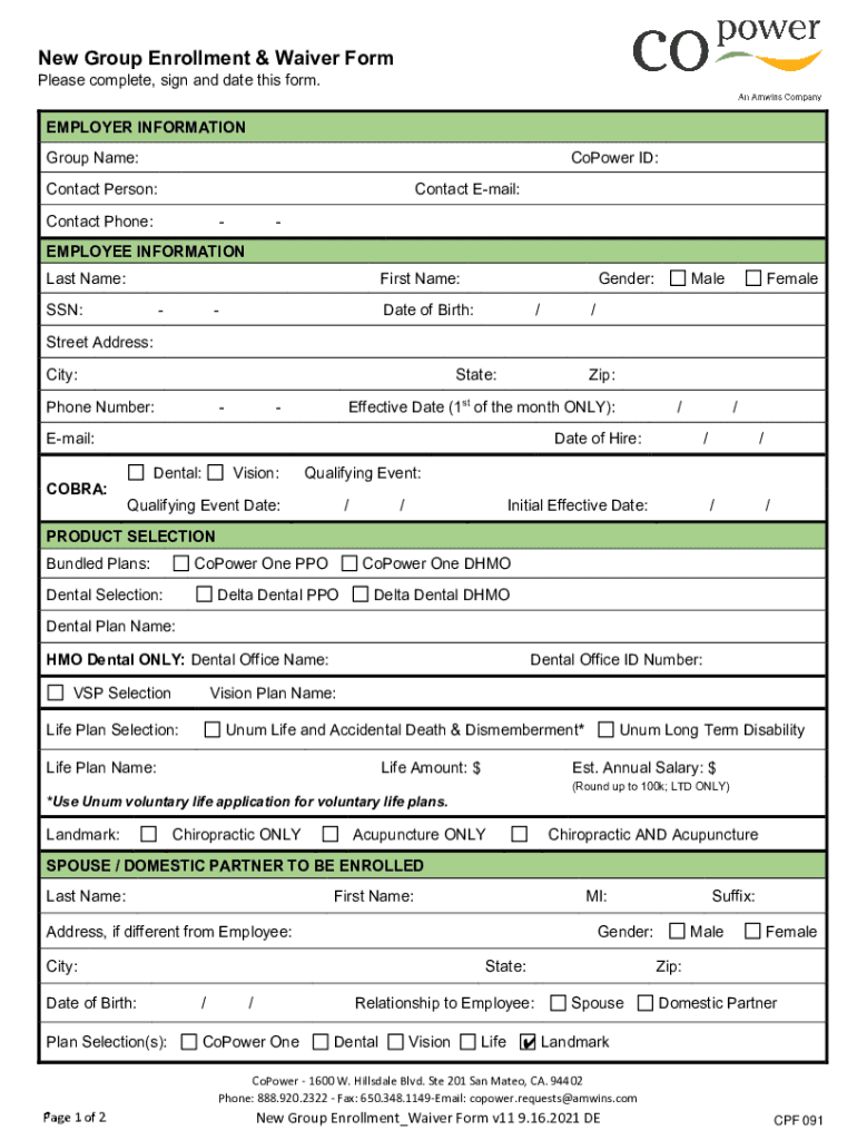 New Group Enrollment & Waiver Form Please complete, sign and date this form. EMPLOYER INFORMATION Group Name:Power ID:Contact Person:Contact Email:Contact Phone:EMPLOYEE INFORMATION Last Name:First