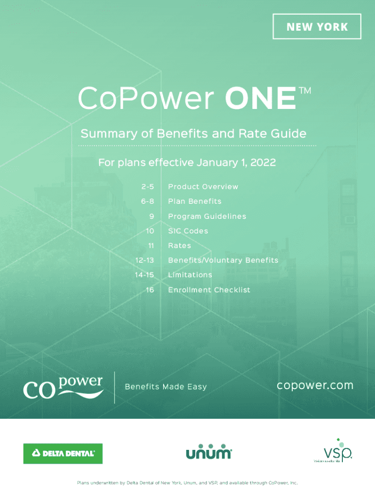 NEW YORKCoPower Summary of Benefits and Rate Guide For plans effective January 1, 2022 25Product Overview68Plan Benefits9 10 11Program Guidelines SIC Codes Rates1213Benefits/Voluntary Benefits1415Limitations16Enrollment