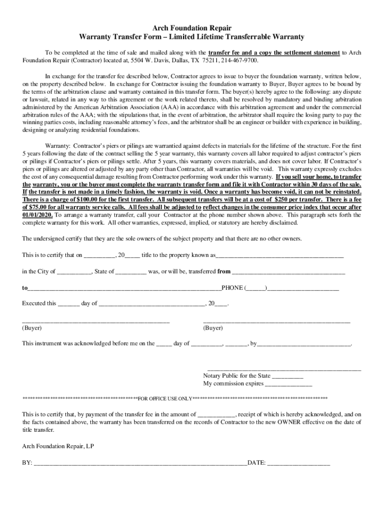 Arch Foundation Repair Warranty Transfer Form Limited Lifetime Transferable Warranty To be completed at the time of sale and mailed along with the transfer fee and a copy the settlement statement