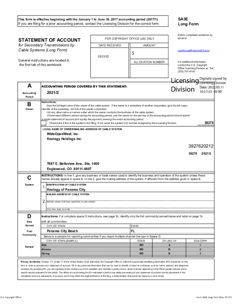 SA3E Long Forms form is effective beginning with the January 1 to June 30, 2017, accounting period (2017/1)If you are filing for a prior accounting period, contact the Licensing Division for the correct