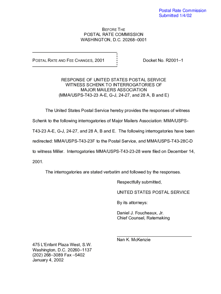 Postal Rate Commission Submitted 1/4/02 BEFORE THE POSTAL RATE COMMISSION WASHINGTON, D.C. 202680001POSTAL RATE AND FEE CHANGES, 2001Docket No. R20011RESPONSE OF UNITED STATES POSTAL SERVICE WITNESS