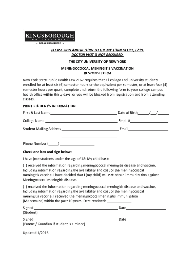 PLEASE SIGN AND RETURN TO THE TURN OFFICE, F219. DOCTOR VISIT IS NOT REQUIRED. THE CITY UNIVERSITY OF NEW YORK MENINGOCOCCAL MENINGITIS VACCINATION RESPONSE FORM New York State Public Health Law 2167