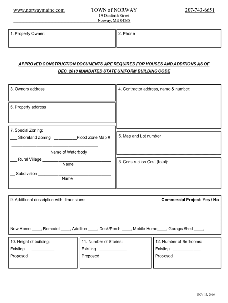 WWW.norwaymaine.common of NORWAY207743665119 Danforth Street Norway, ME 042681. Property Owner:2. Preapproved CONSTRUCTION DOCUMENTS ARE REQUIRED FOR HOUSES AND ADDITIONS AS OF DEC. 2010 MANDATED