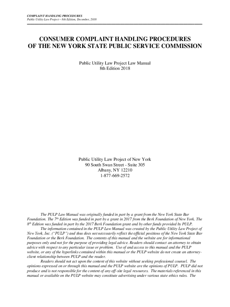 COMPLAINT HANDLING PROCEDURES Public Utility Law Project 8th Edition, December 2018 ___ ___CONSUMER COMPLAINT HANDLING PROCEDURES OF THE NEW YORK STATE PUBLIC SERVICE COMMISSION Public Utility Law