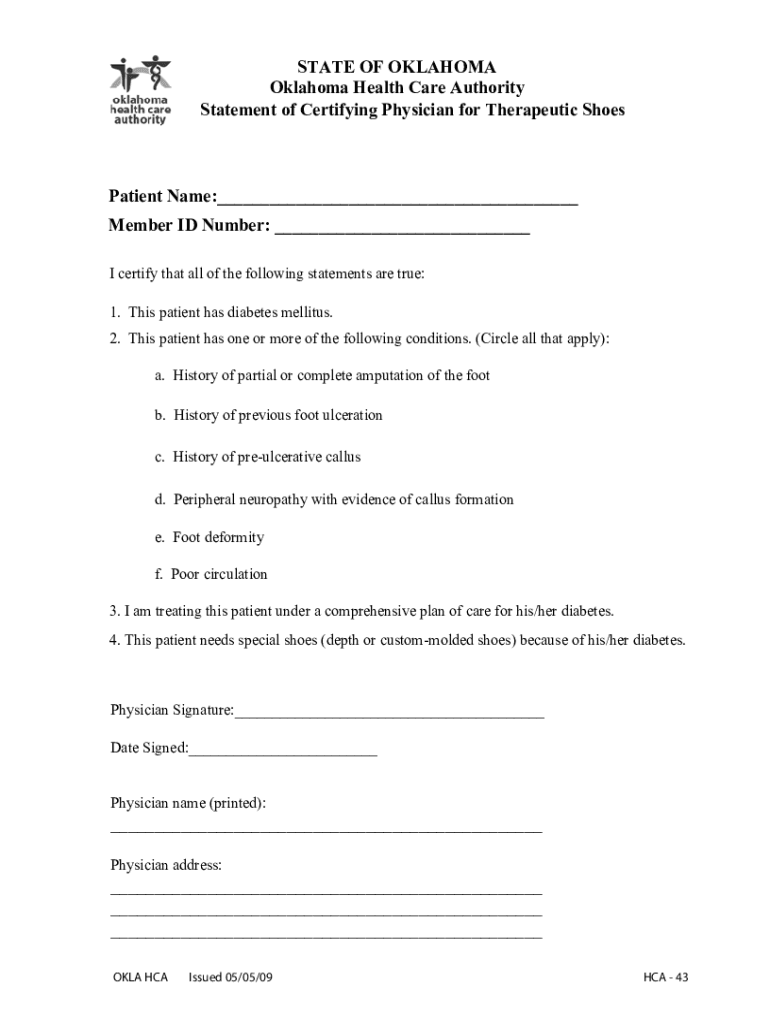 STATE OF OKLAHOMA Health Care Authority Statement of Certifying Physician for Therapeutic ShoesPatient Name:___ Member ID Number: ___ I certify that all the following statements are true: 1. This