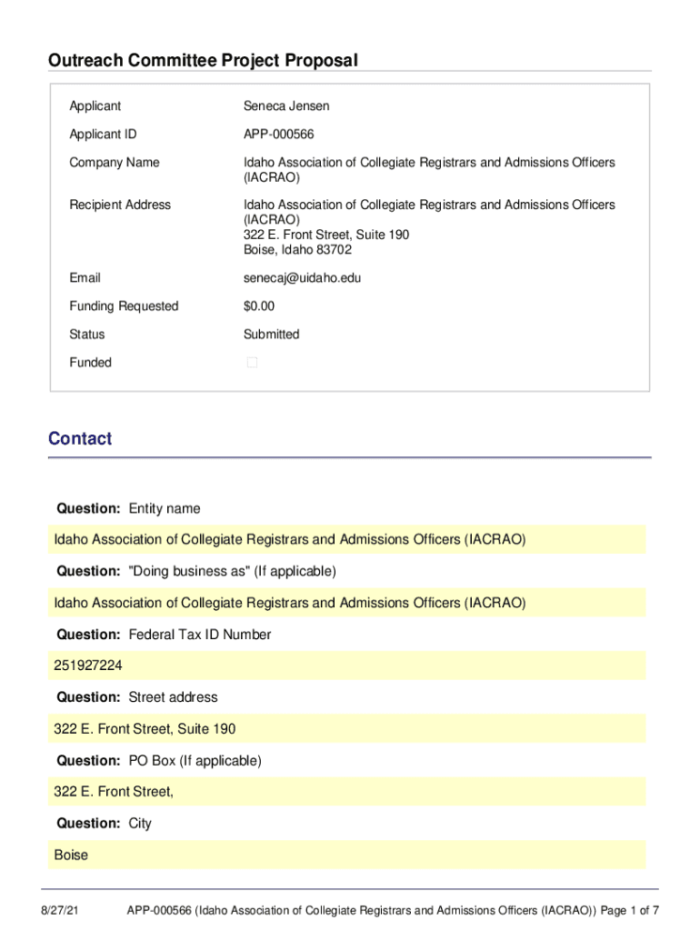Outreach Committee Project Proposal Applicant Seneca JensenApplicant IDAPP000566Company Name Idaho Association of Collegiate Registrars and Admissions Officers (MACRO)Recipient Address Idaho Association