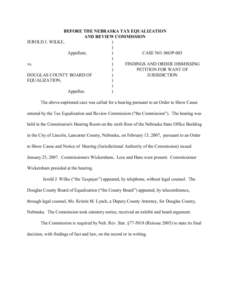 BEFORE THE NEBRASKA TAX EQUALIZATION AND REVIEW COMMISSION JEROLD J. WILDE,) ) Appellant,) CASE NO. 06OP003) vs.) FINDINGS AND ORDER DISMISSING) PETITION FOR WANT OF DOUGLAS COUNTY BOARD OF) JURISDICTION