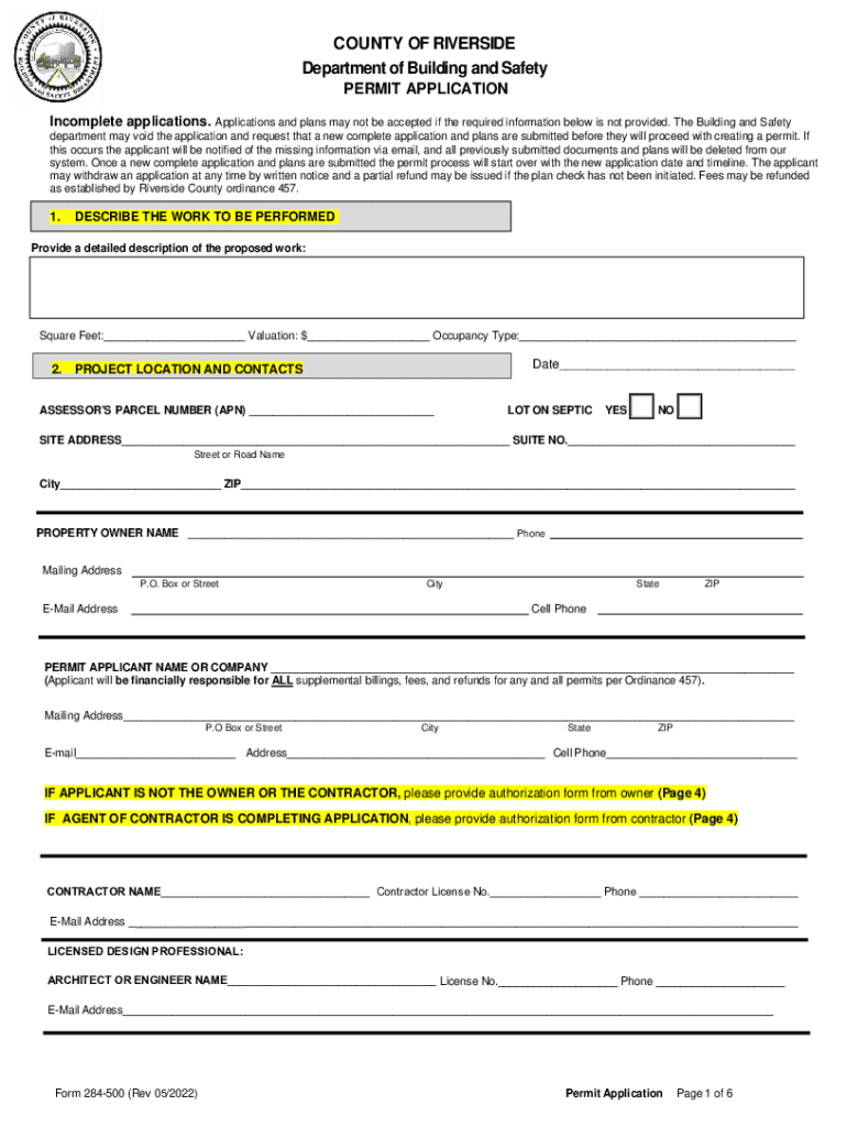 COUNTY OF RIVERSIDE Department of Building and Safety PERMIT APPLICATION Incomplete applications. Applications and plans may not be accepted if the required information below is not provided. The