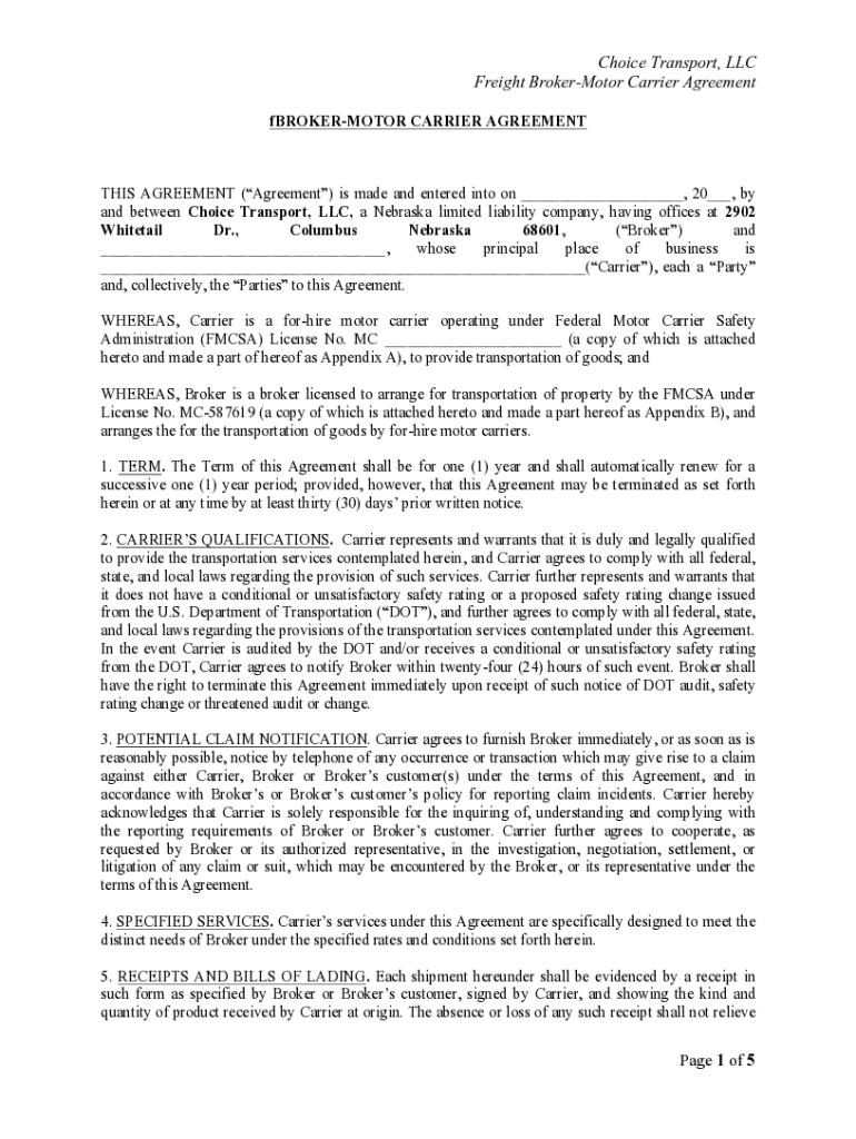 Choice Transport, LLC Freight BrokerMotor Carrier Agreement fBROKERMOTOR CARRIER AGREEMENTS AGREEMENT (Agreement) is made and entered into on ___, 20___, by and between Choice Transport, LLC, a Nebraska