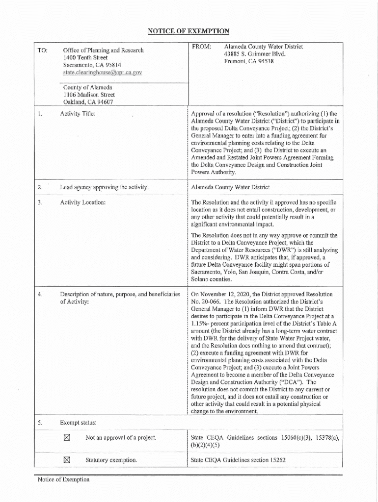 NOTICE OF EXEMPTION TO:Office of Planning and Research 1400 Tenth Street Sacramento, CA 95814 state.clearinghouse@opr.ca.govFROM:Alameda County Water District 43885 S. Grimmer Blvd. Fremont, CA 94538County