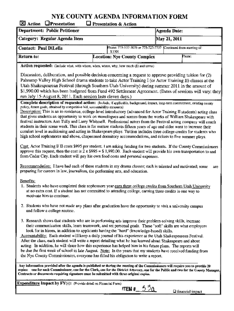 NYE COUNTY AGENDA INFORMATION FORM Presentation J Presentation & Activation Department: Public PetitionerAgenda Date:Category: Regular Agenda Item Contact: Paul DiLellaReturn to: Action requested:May