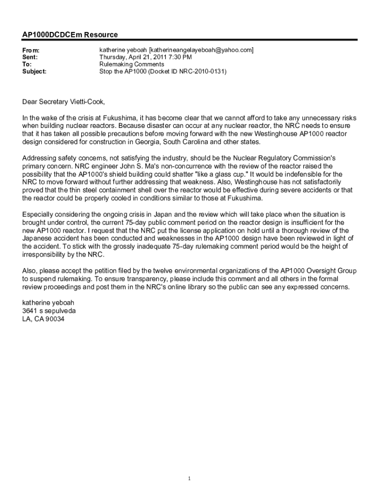 AP1000DCDCEm Resource From: Sent: To: Subject:Katherine yeah [katherineangelayeboah@yahoo.com] Thursday, April 21, 2011 7:30 PM Rule making Comments Stop the AP1000 (Docket ID NRC20100131)Dear Secretary