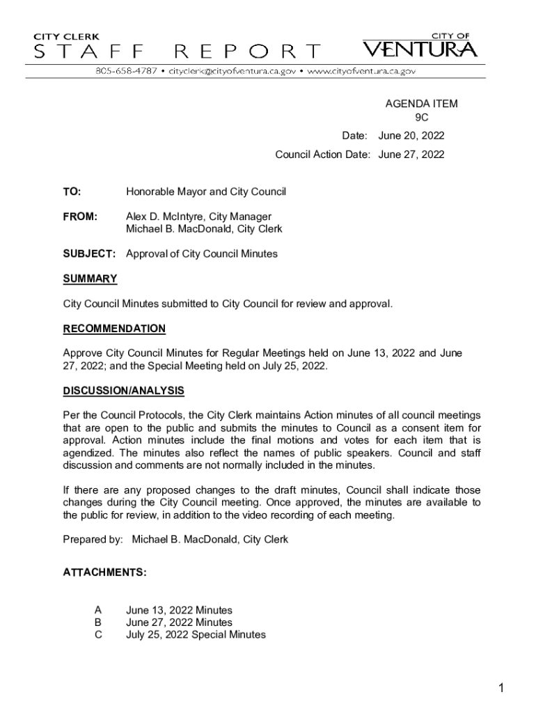AGENDA ITEM 9C Date:June 20, 2022Council Action Date: June 27, 2022, TO:Honorable Mayor and City Councilor:Alex D. McIntyre, City Manager Michael B. MacDonald, City ClerkSUBJECT:Approval of City Council