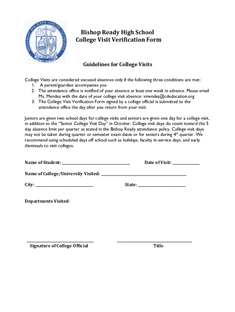 Bishop Ready High School College Visit Verification FormGuidelines for College Visits are considered excused absences only if the following three conditions are met: 1. A parent/guardian accompanies
