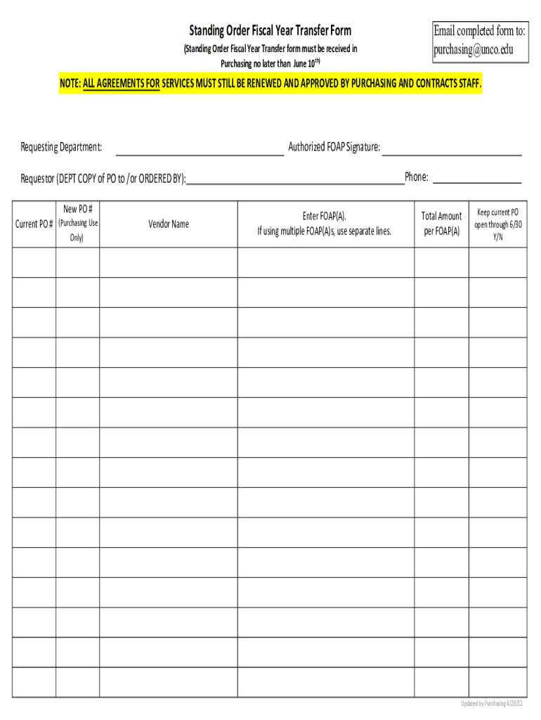 Standing Order Fiscal Year Transfer Foresail completed form to: purchasing@unco.edu(Standing Order Fiscal Year Transfer form must be received in Purchasing no later than June 10th)NOTE: ALL AGREEMENTS