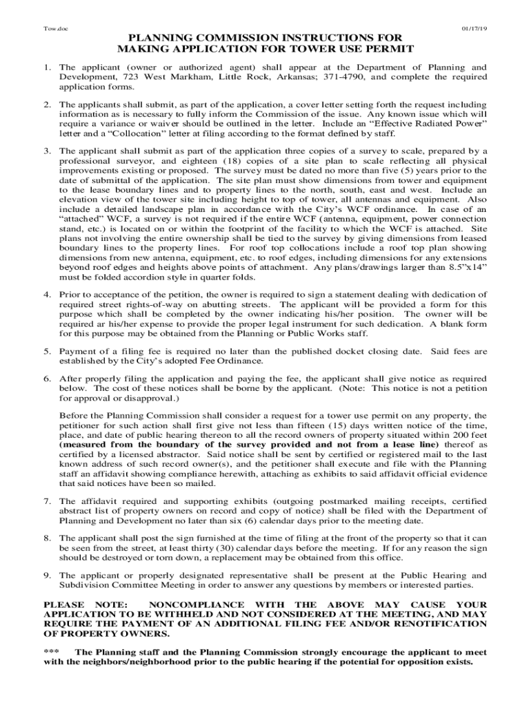 Tow.doc01/17/19PLANNING COMMISSION INSTRUCTIONS FOR MAKING APPLICATION FOR TOWER USE PERMIT 1. The applicant (owner or authorized agent) shall appear at the Department of Planning and Development,