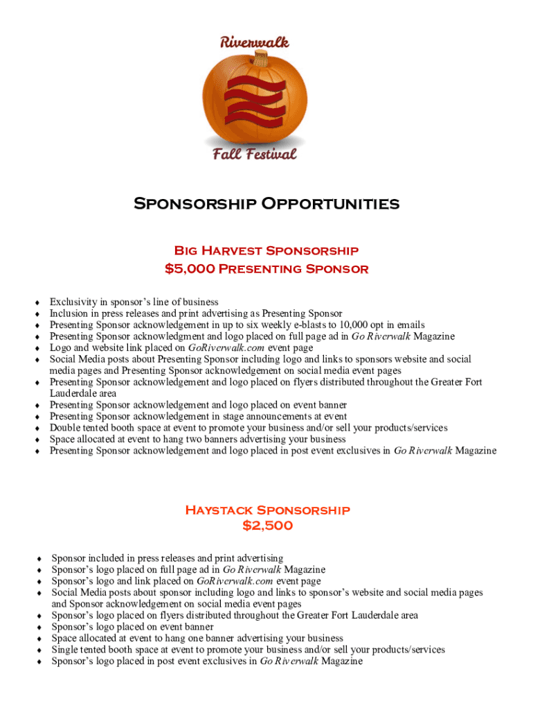 Sponsorship Opportunities Big Harvest Sponsorship $5,000 Presenting Sponsor Exclusivity in sponsors line of business Inclusion in press releases and print advertising as Presenting Sponsor acknowledgement